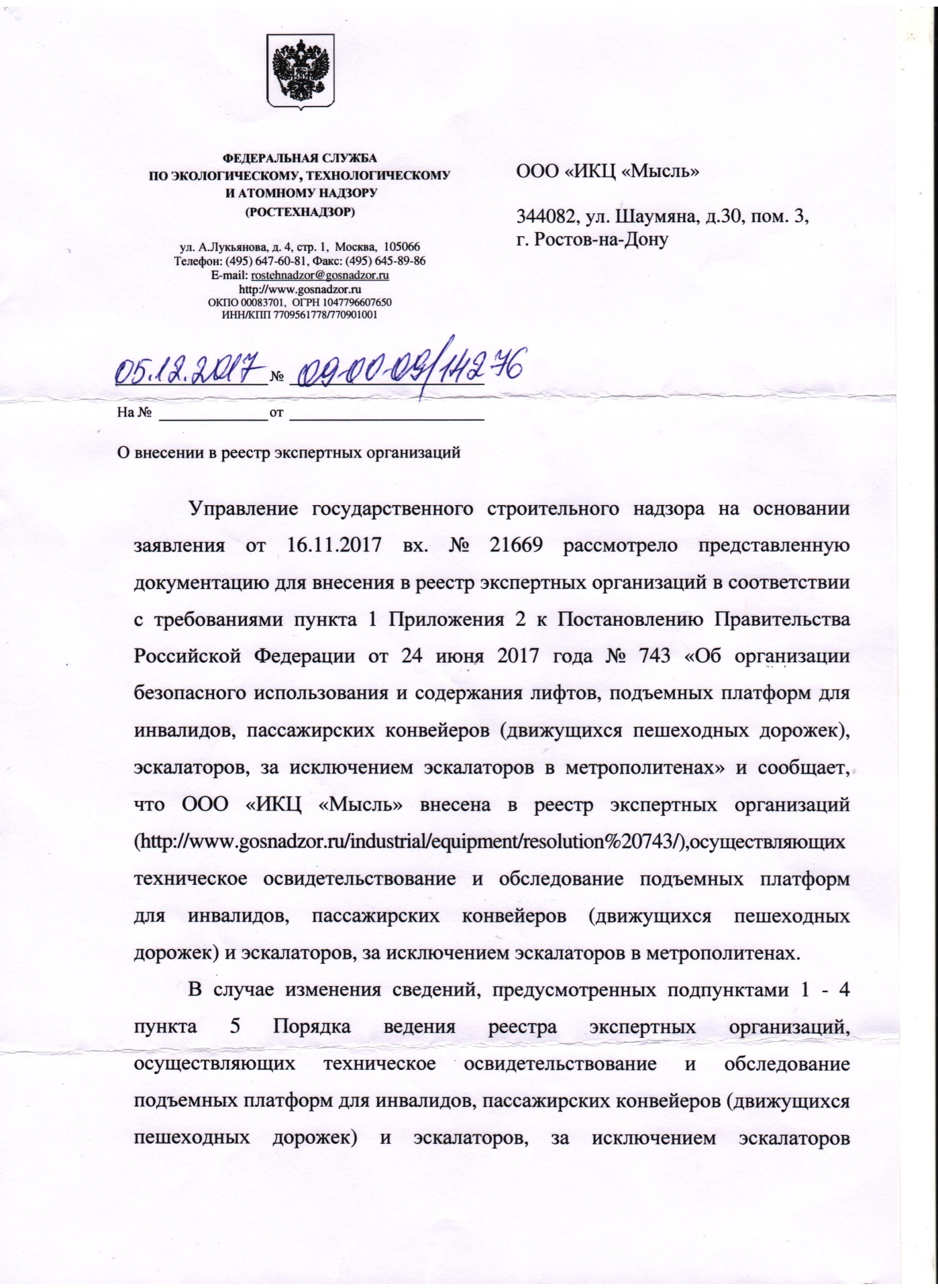 В структуре ООО «ИКЦ «Мысль» организован и прошел аккредитацию в Совете по профессиональным квалификациям в лифтовой отрасли, сфере подъемных сооружений и вертикального транспорта (СПК) Центр оценки квалификаций (ЦОК), наделенный полномочиями по проведению независимой оценки квалификаций обслуживающего персонала и специалистов лифтовой отрасли, подъемных сооружений и канатных дорог в соответствии с Федеральным законом от 3 июля 2016 г. № 238-ФЗ «О независимой оценке квалификации».